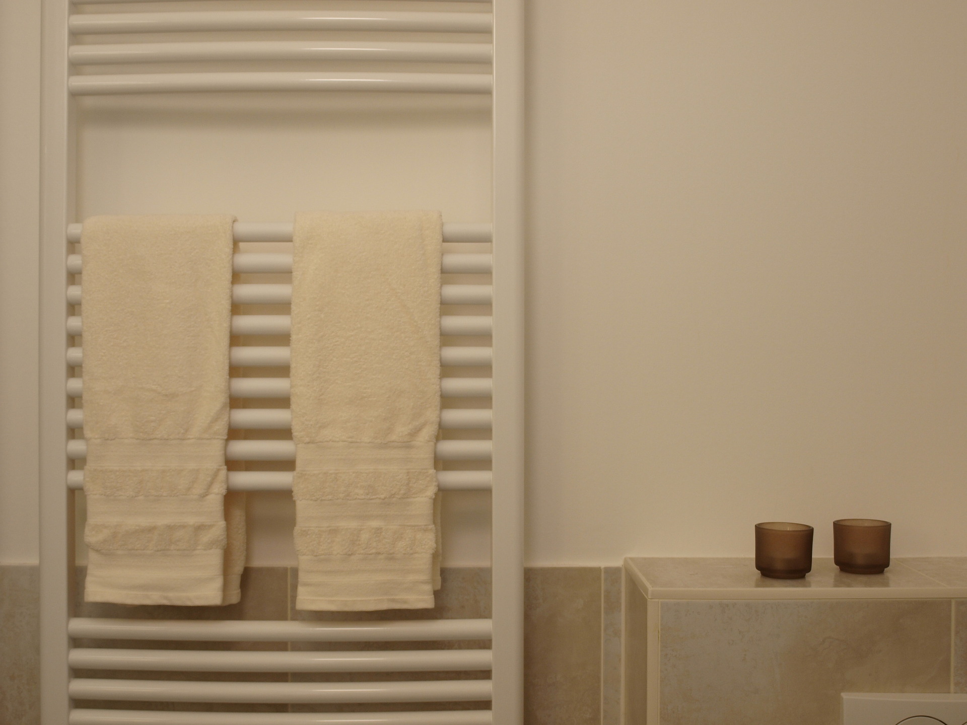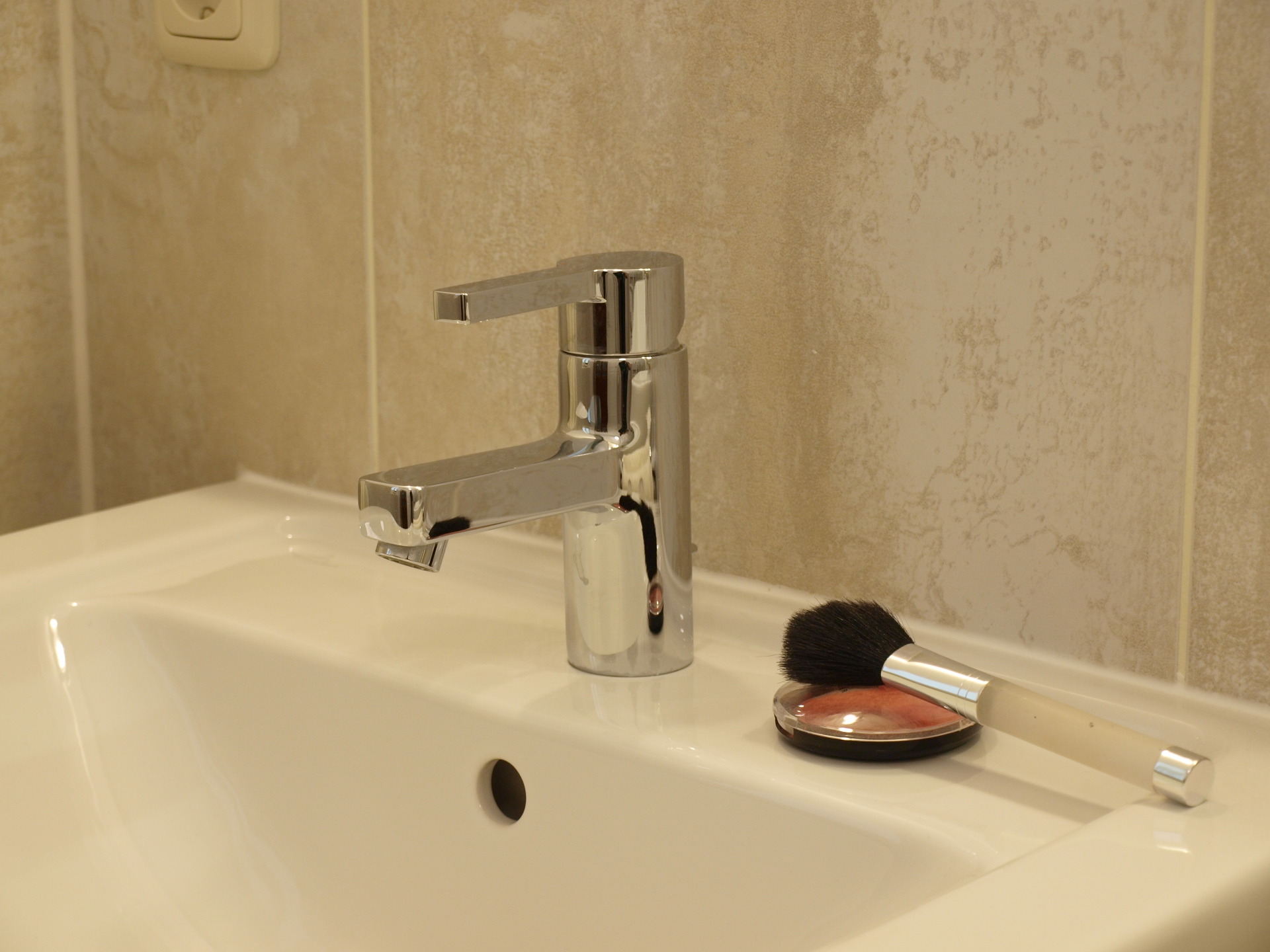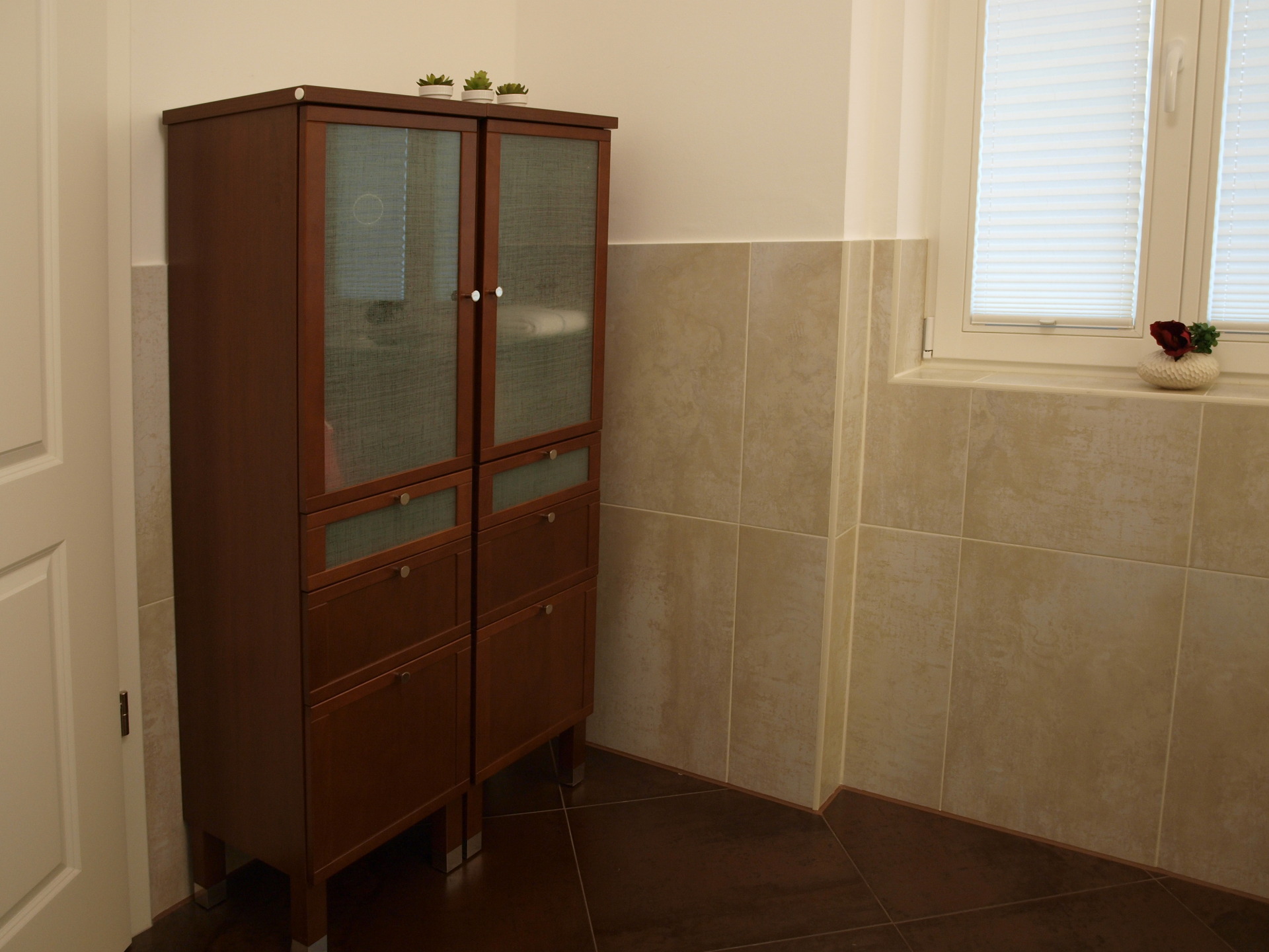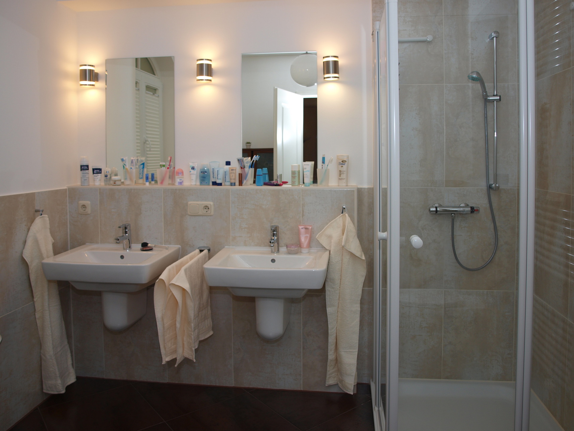 Im Badezimmer stehen für Sie zwei Wachtische, eine große Dusche, WC und ein geräumiger Badschrank zur Verfügung: