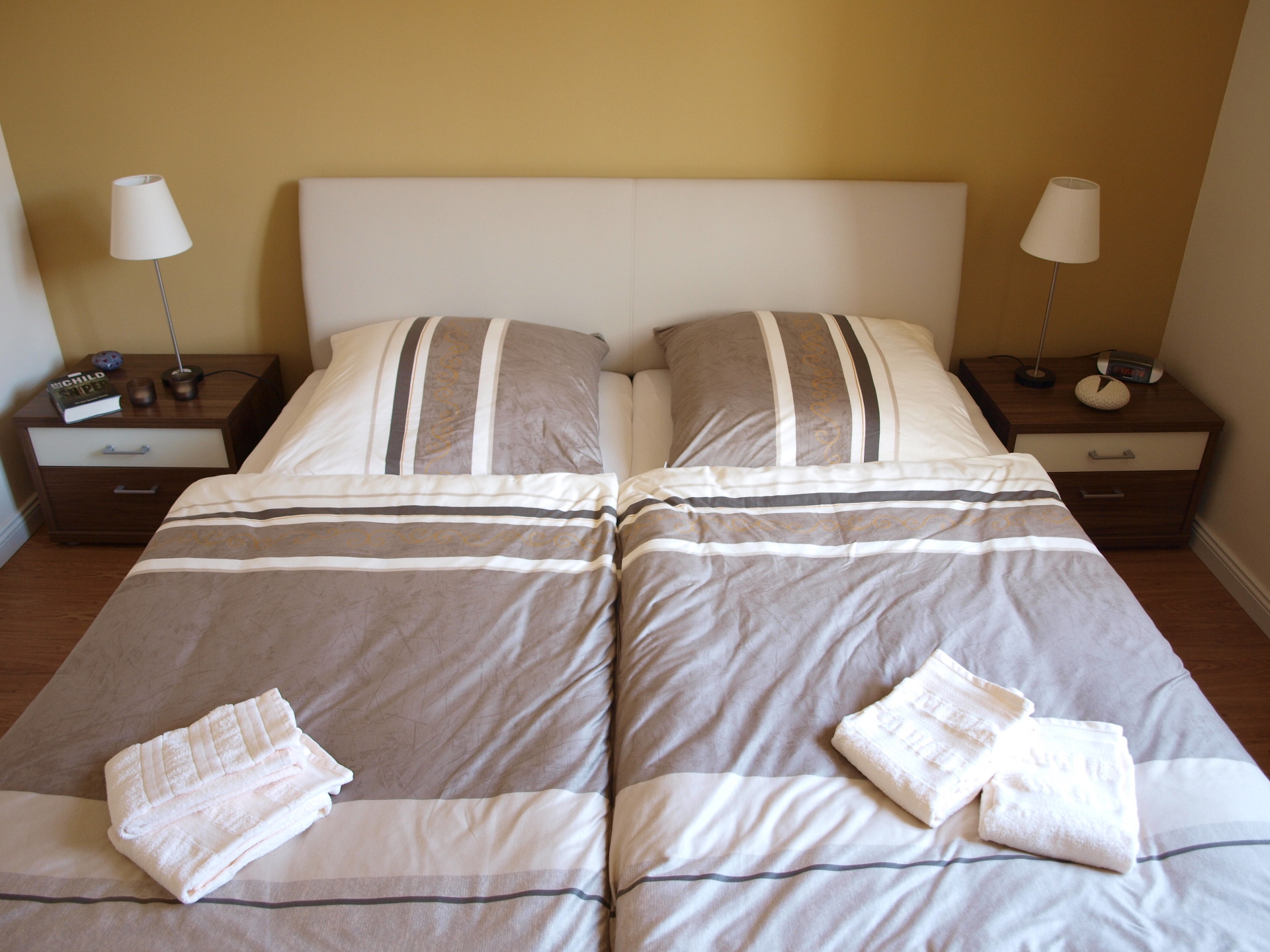 Das Schlafzimmer verfügt über ein großes Doppelbett, zwei Nachttischchen mit Leselampen und einen sehr geräumigen Schrank.