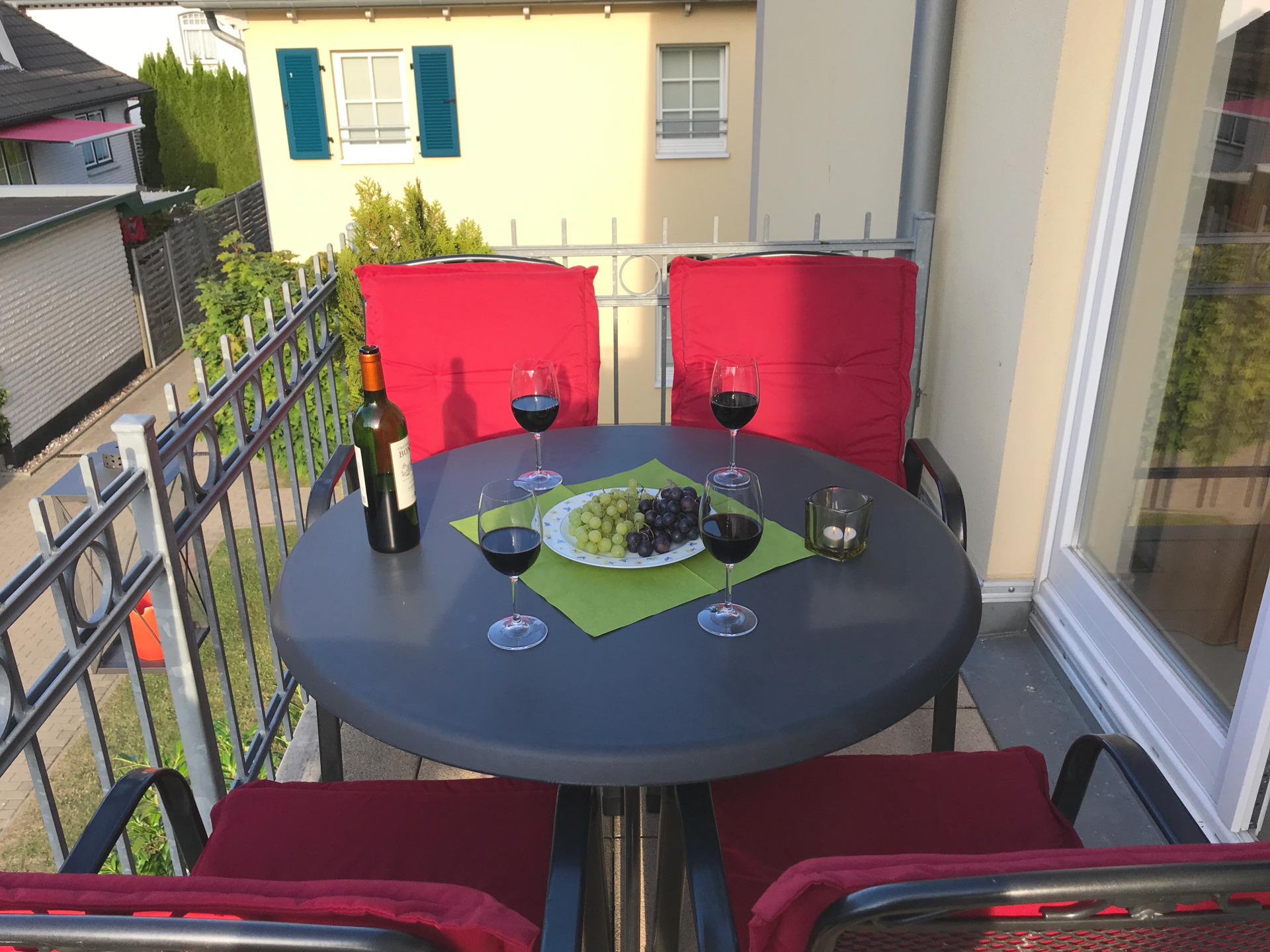 Der geräumige Balkon bietet Platz für vier Personen und Sie können hier Ihr frühes Frühstück oder den Abend bei Sonnenschein verbringen: